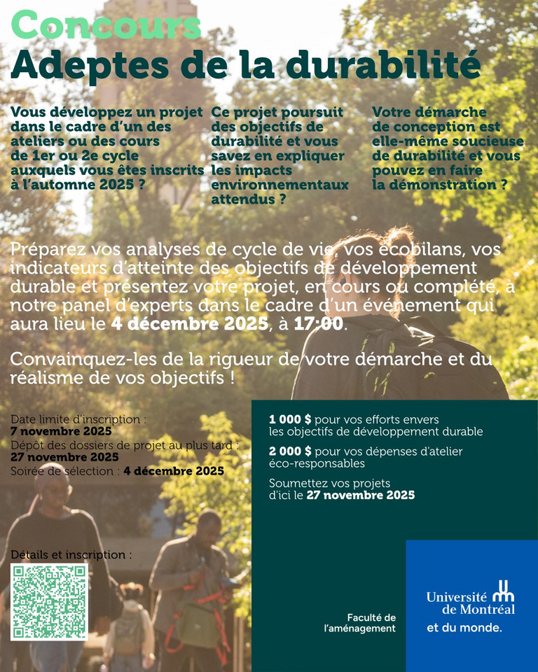 • Au plus tard le 7 novembre 2025 à 23:59, les personnes souhaitant participer au concours doivent faire parvenir à faculteamenagement@umontreal.ca :