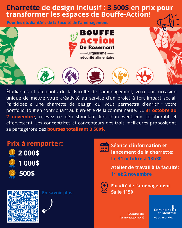 Étudiantes et étudiants de la Faculté de l'aménagement, voici une occasion unique de mettre votre créativité au service d'un projet à fort impact social. Participez à une charrette de design qui vous permettra d'enrichir votre portfolio, tout en contribuant au bien-être de la communauté. Du 31 octobre au 2 novembre, relevez ce défi stimulant lors d'un week-end collaboratif et effervescent. Les conceptrices et concepteurs des trois meilleures propositions se partageront des bourses totalisant 3 500 $.