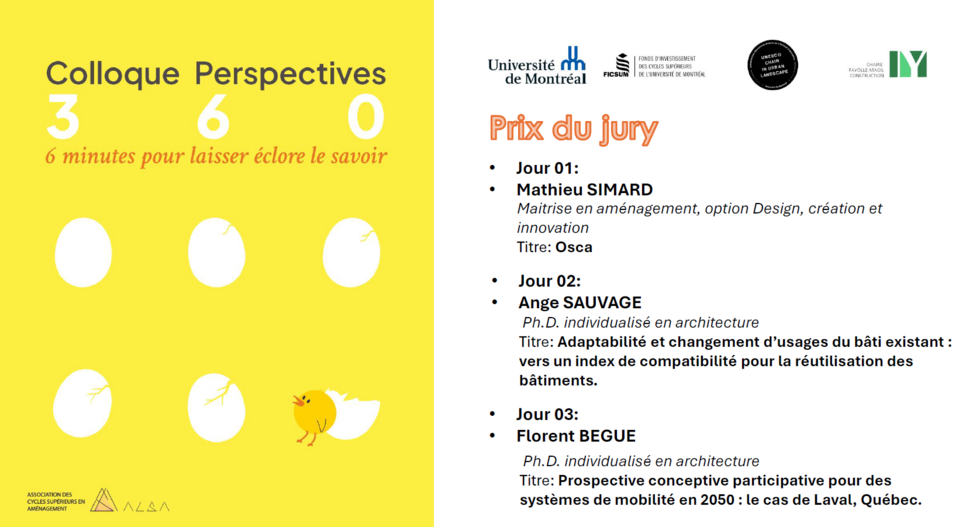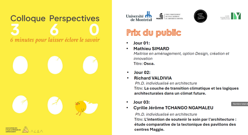 L'édition 2026 du colloque Perspectives 360° s'est déroulée du 17 au 20 mars 2026 sous le thème "6 minutes pour laisser éclore le savoir" à la Faculté de l'aménagement.
