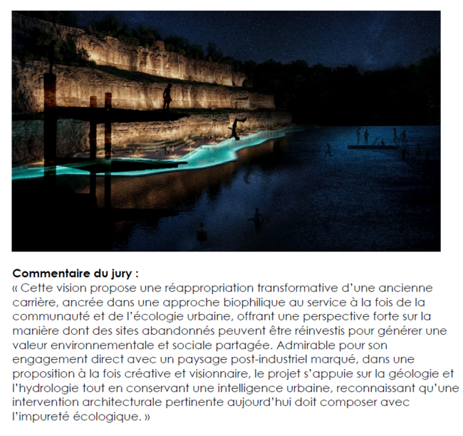 Organisé en partenariat avec l'UQAM, l'Université de Montréal et l'Université McGill, le concours invitait cette année les participantes et participants à imaginer des interventions sur des sites riverains pour proposer des expériences de baignade nocturne, autour du thème Bain de nuit.