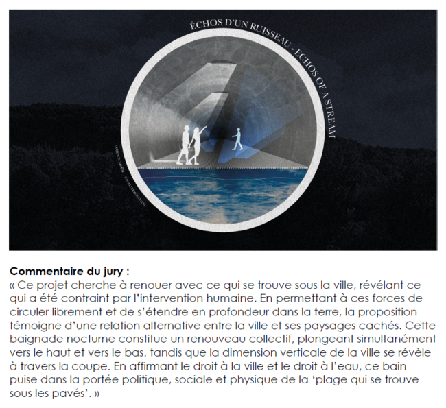 Tamara Kliuket, Étienne Lachance, Nino Ramdani (baccalauréat en sciences, Architecture) et Tommaso Montanari (philosophie en échange) récoltent aussi une mention spéciale pour leur proposition Échos d’un ruisseau.