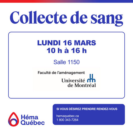 Collecte de sang Héma-Québec à la Faculté de l’aménagement de l’Université de Montréal - 16 mars 2026