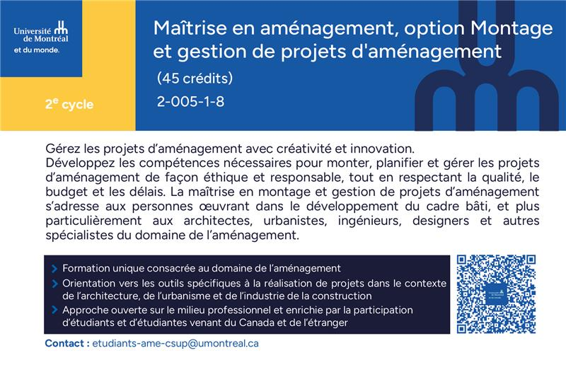 Que vous soyez architecte, urbaniste, designer ou tout autre professionnelle ou professionnel de l’aménagement, ce programme unique en son genre s’adresse à vous.
